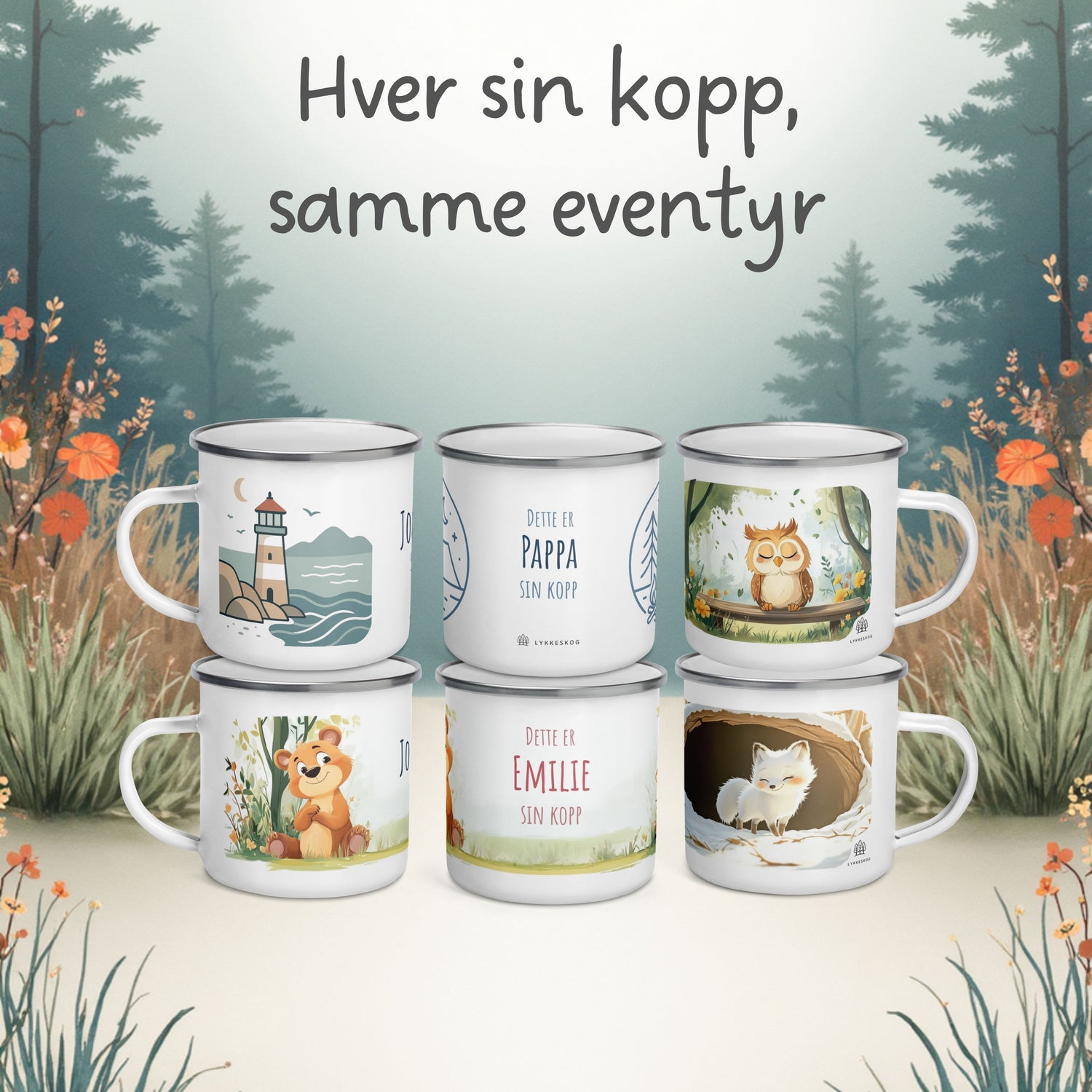 Lag kopper til hele familien, barna får sine egne med navn og motiv, og dere kan legge til kopper til mamma, pappa, bestemor og bestefar.