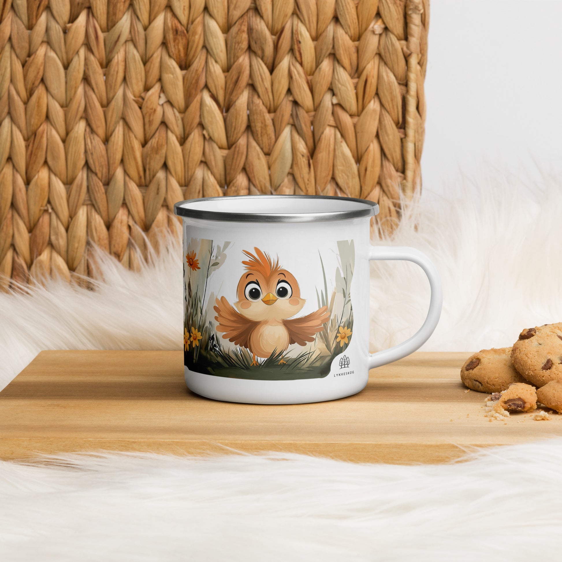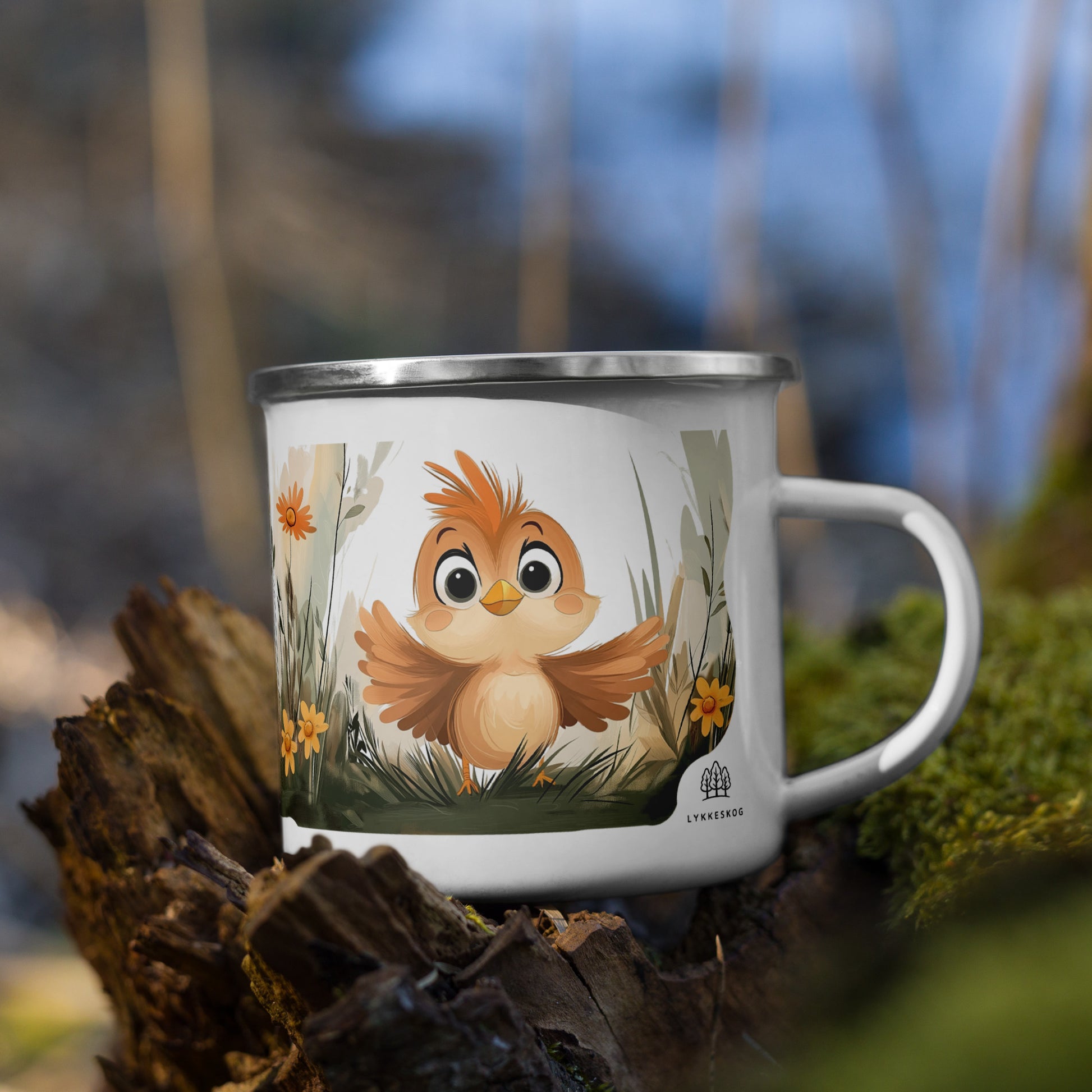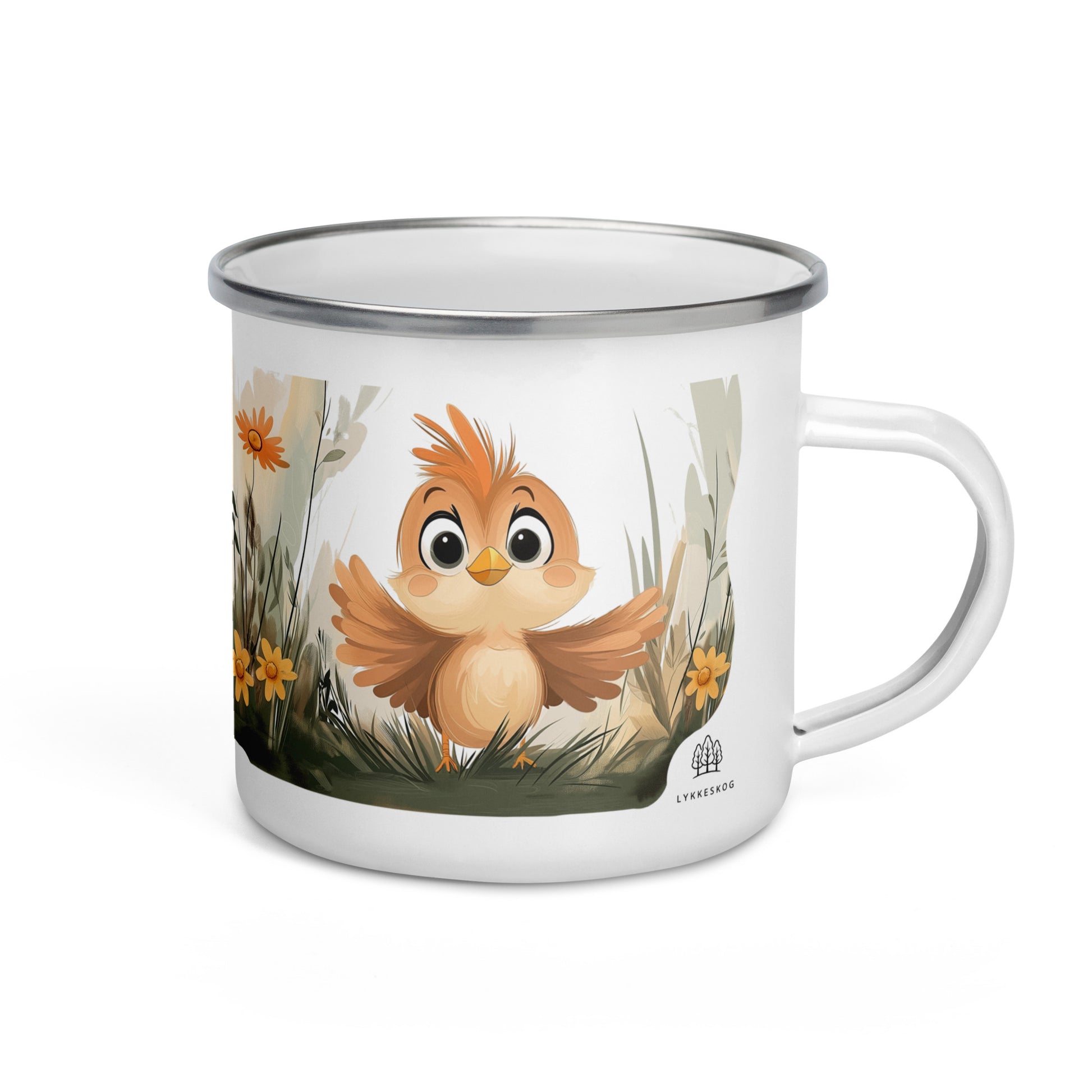 Med en glad, fjærkledd venn midt i en blomstereng, er det nesten umulig å starte dagen i dårlig humør. En kopp som gjør kalde dager litt lunere og minner deg på å nyte de små øyeblikkene.