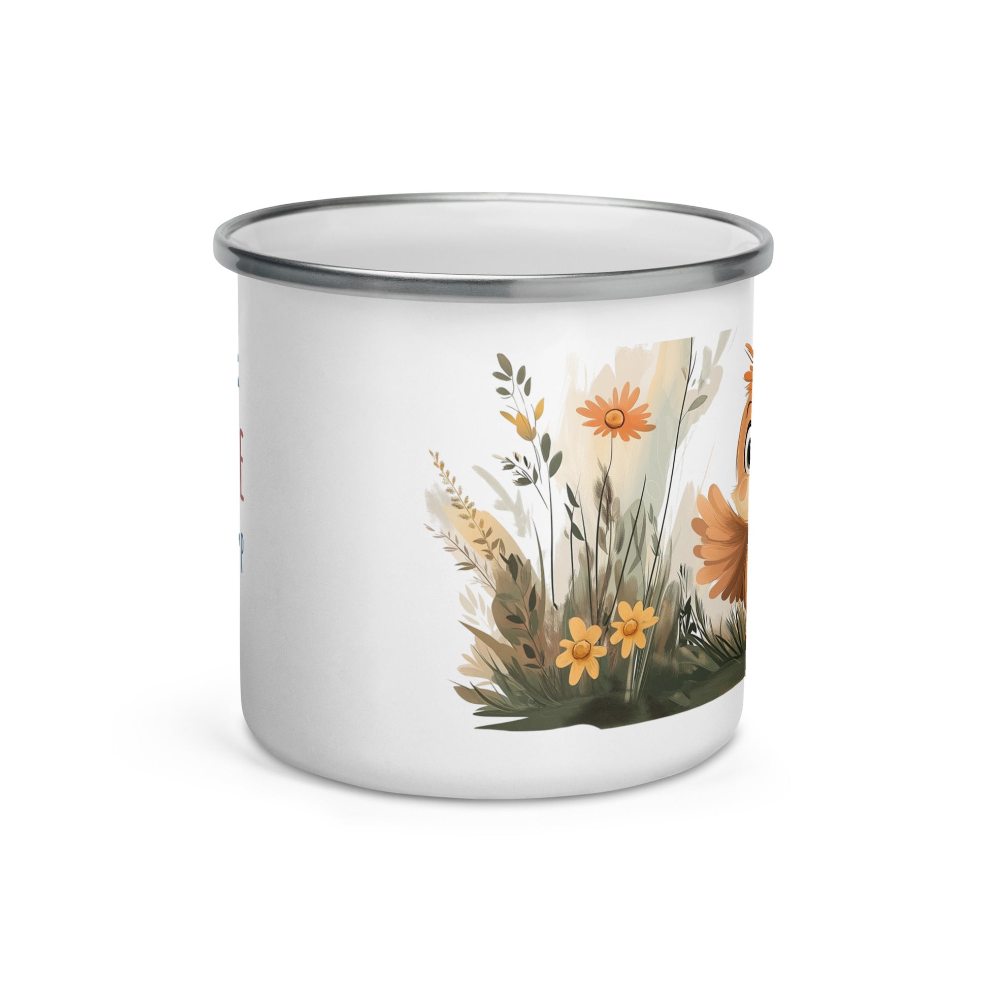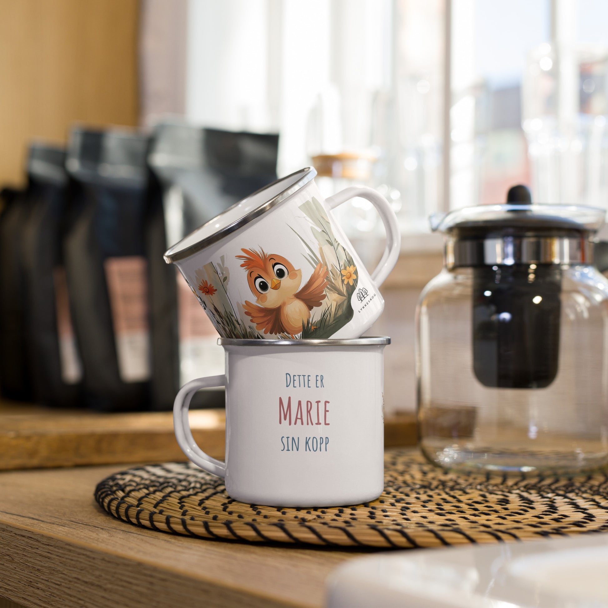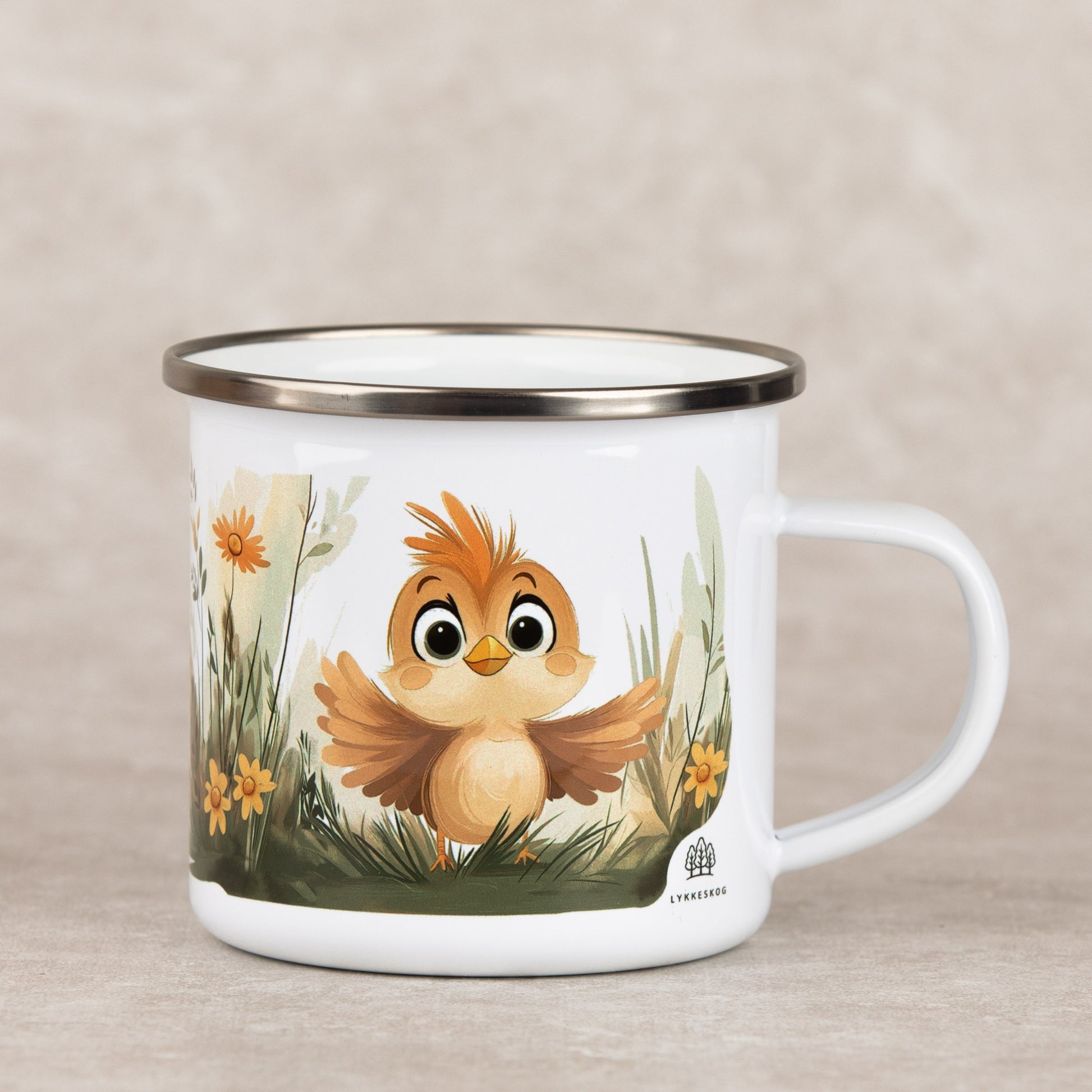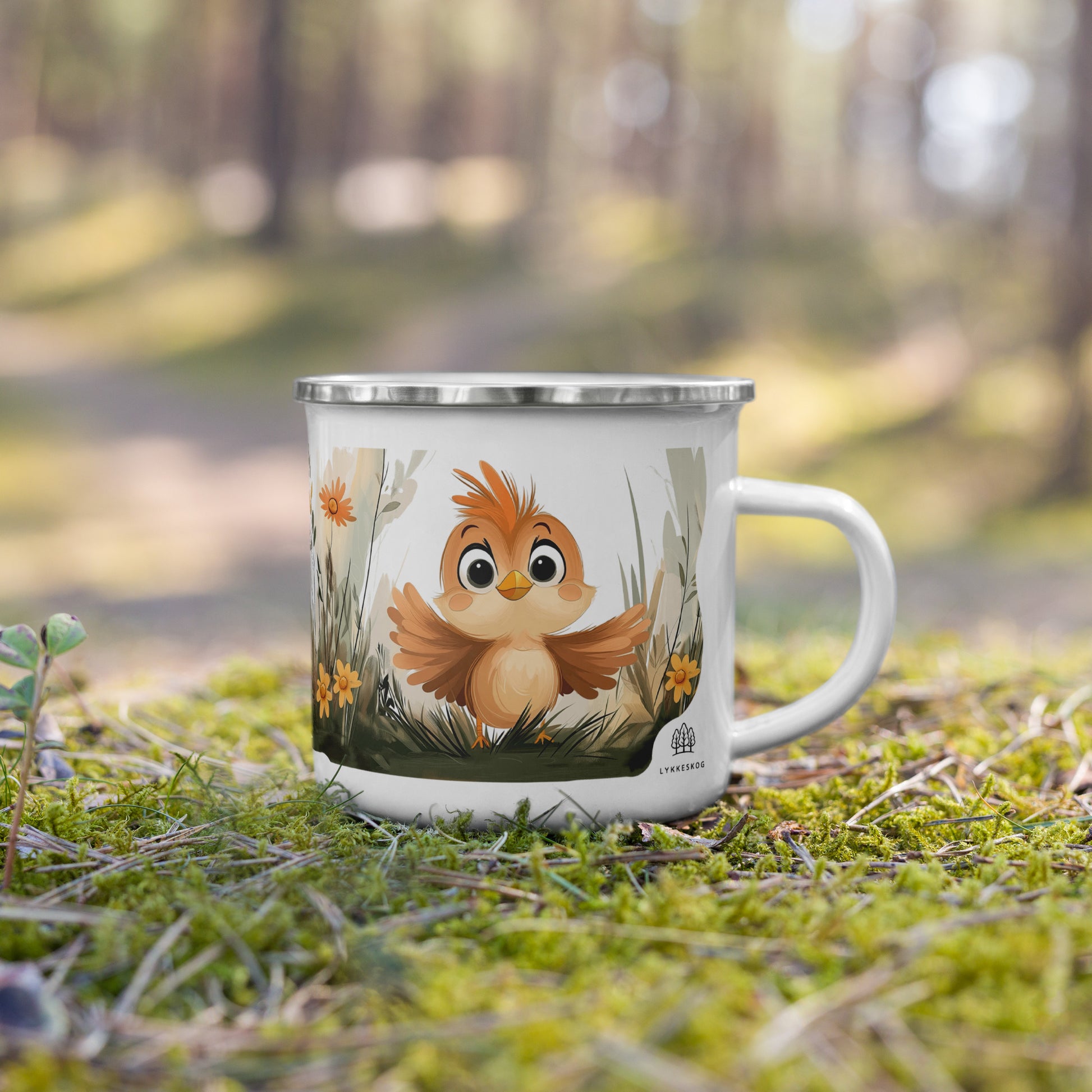 Med en glad, fjærkledd venn midt i en blomstereng, er det nesten umulig å starte dagen i dårlig humør. En kopp som gjør kalde dager litt lunere og minner deg på å nyte de små øyeblikkene.