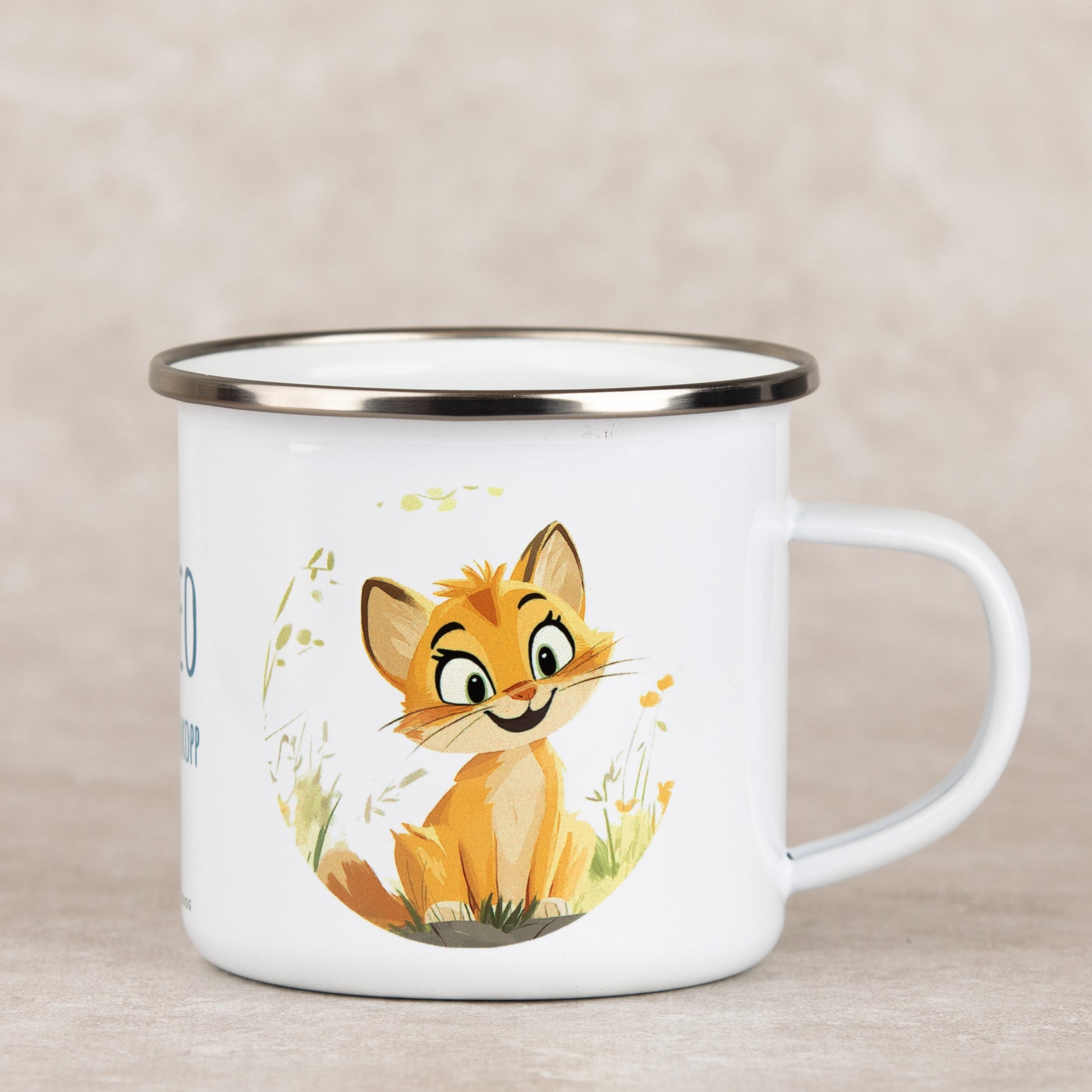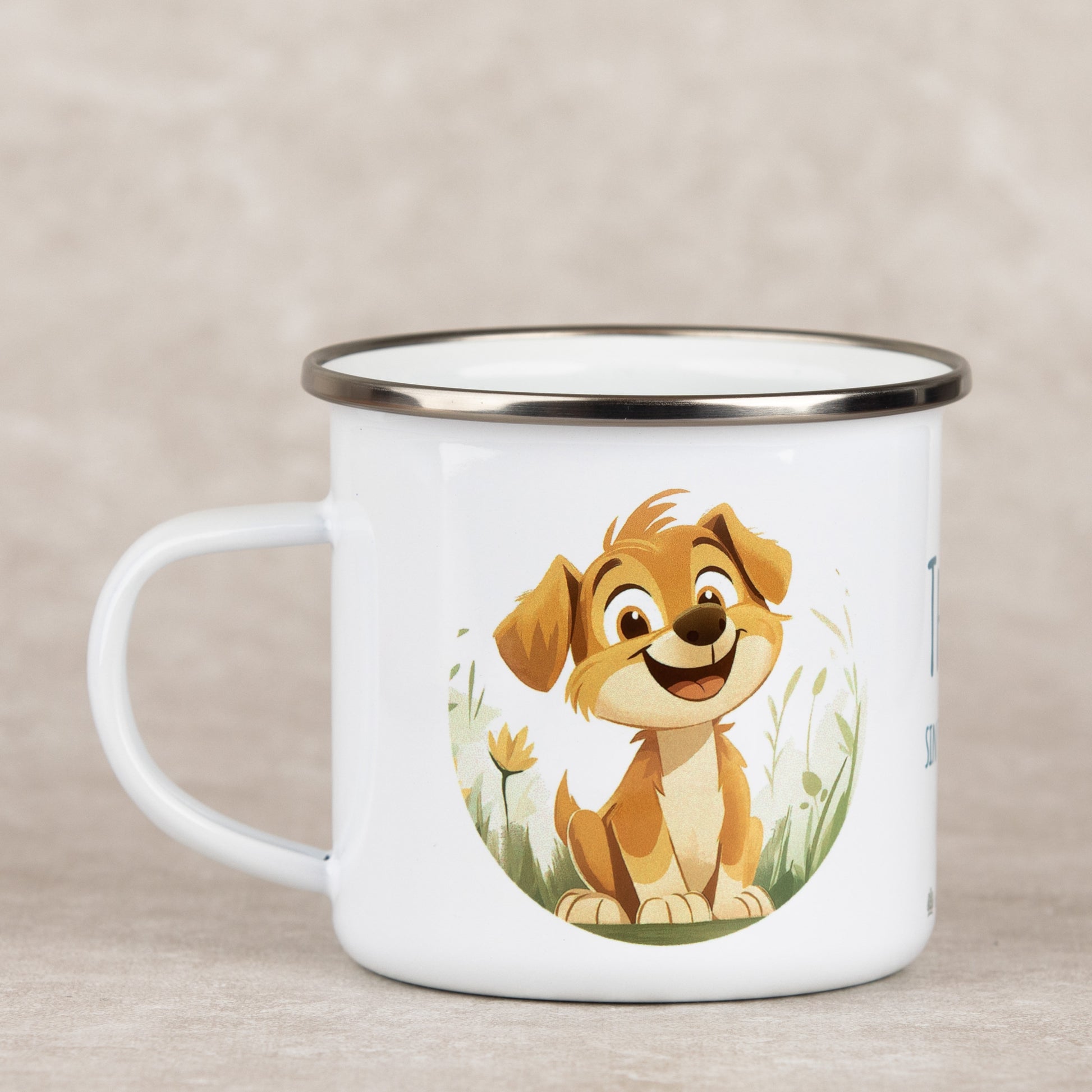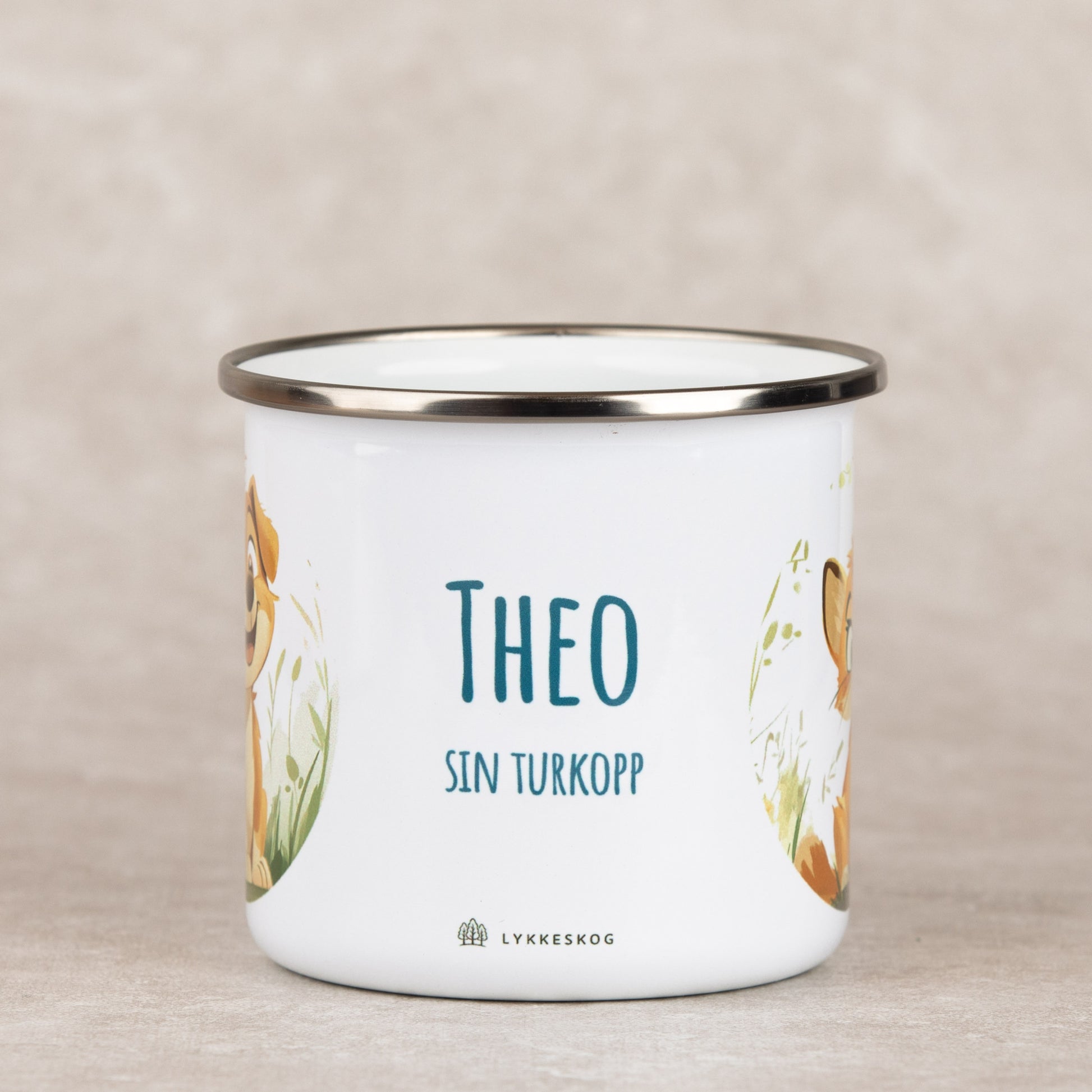 La dagen starte med et smil med denne koppen som har et motiv av en glad hund på ene siden, en katt på den andre, og barnets eget navn stolt plassert i midten. En sjarmerende kopp som gjør hver tur og hver pause litt hyggeligere.
