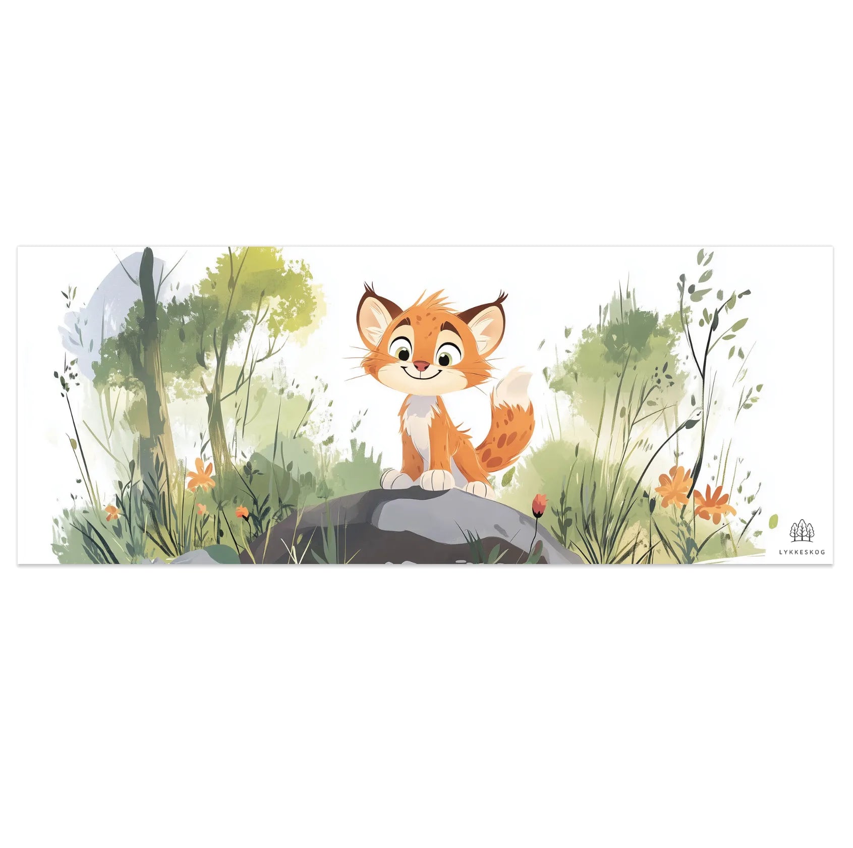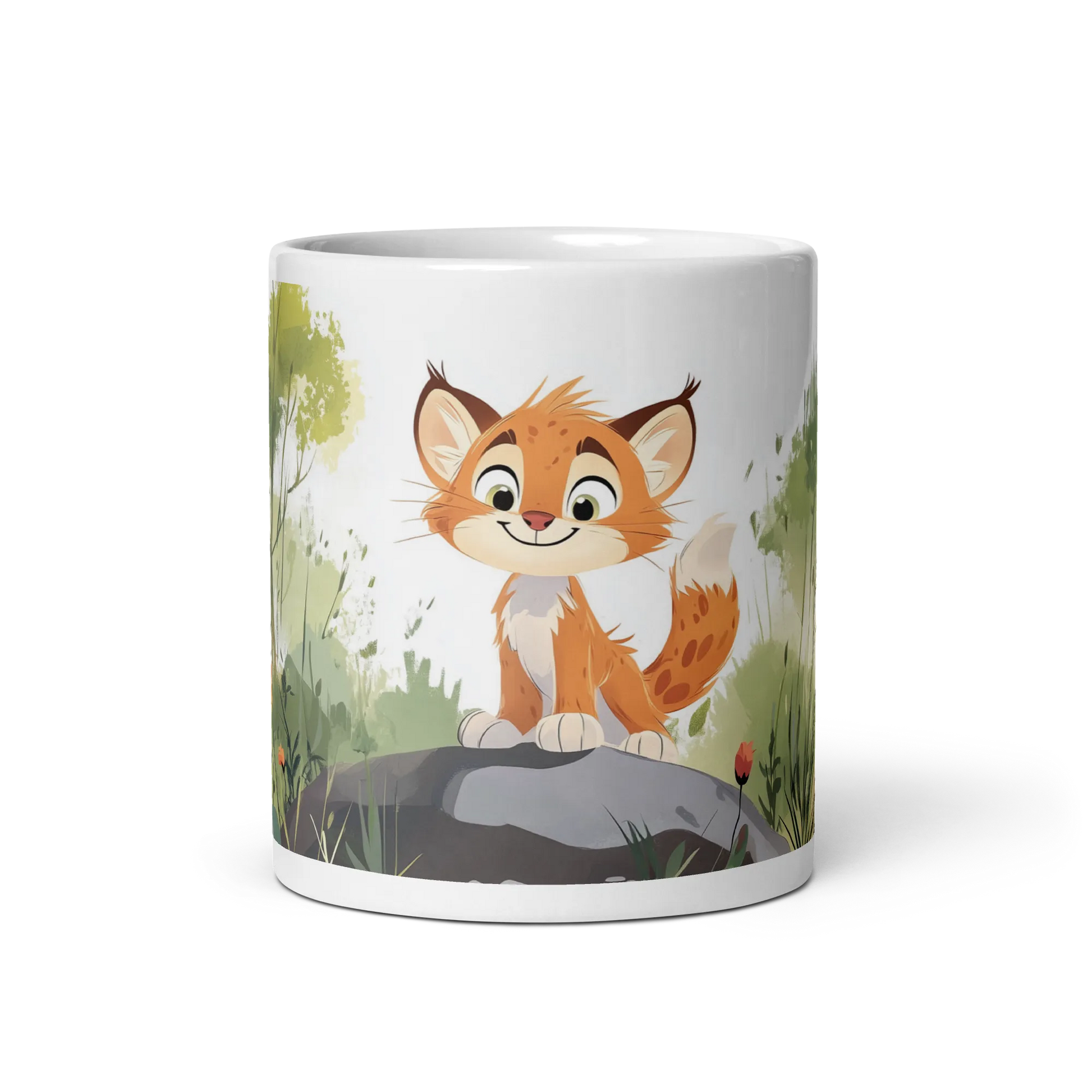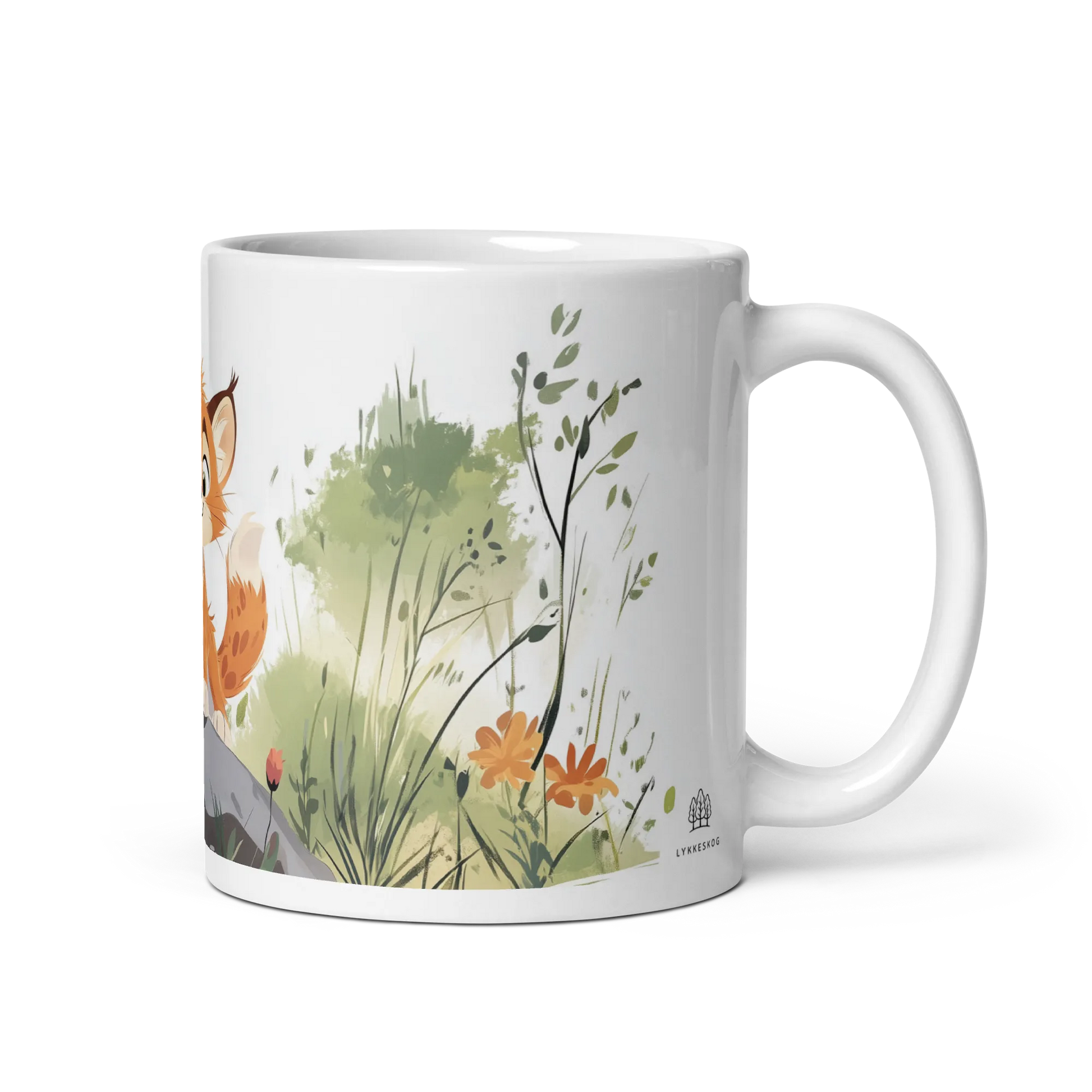 Denne nysgjerrige lille gaupa står stolt på en stein midt i skogen, omgitt av blomster og grønt. Med sitt lekne uttrykk og myke farger bringer motivet både liv og ro til kaffepausen. En herlig kopp for alle som elsker natur, dyr og det lille ekstra som gjør hverdagen koselig.