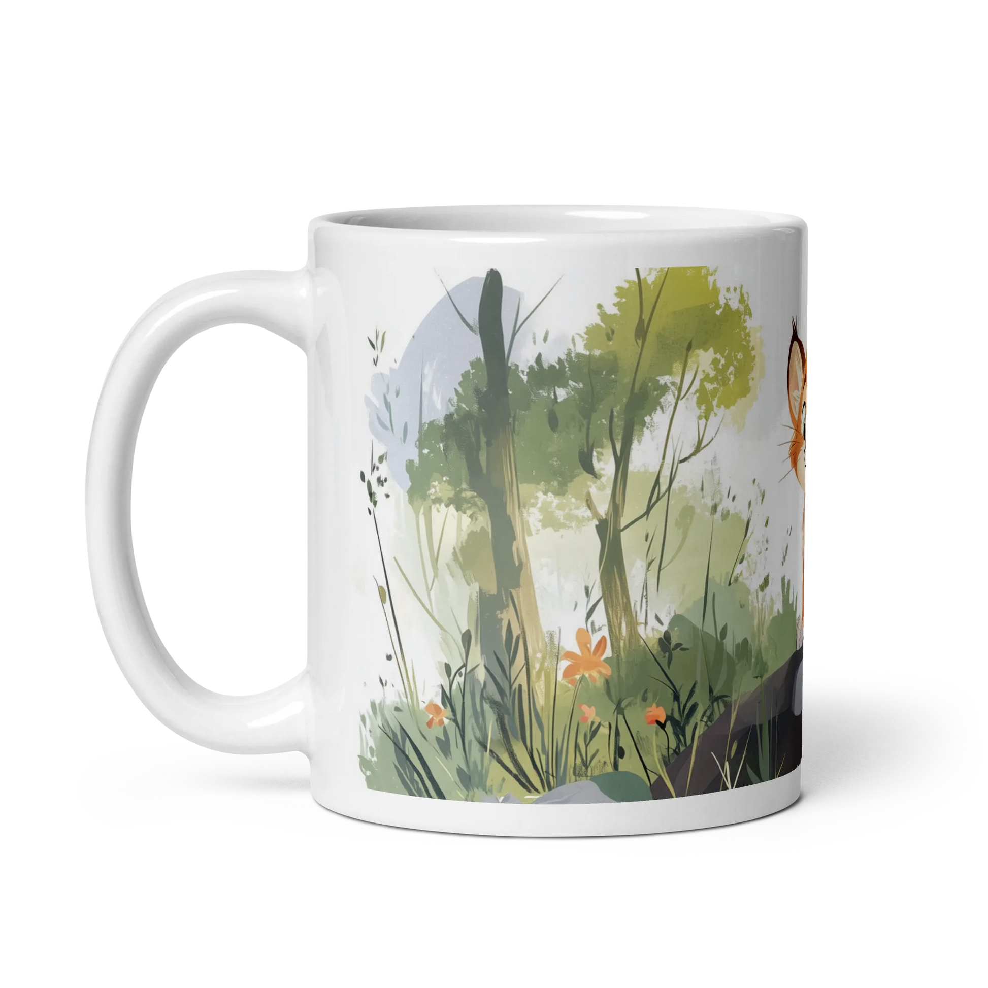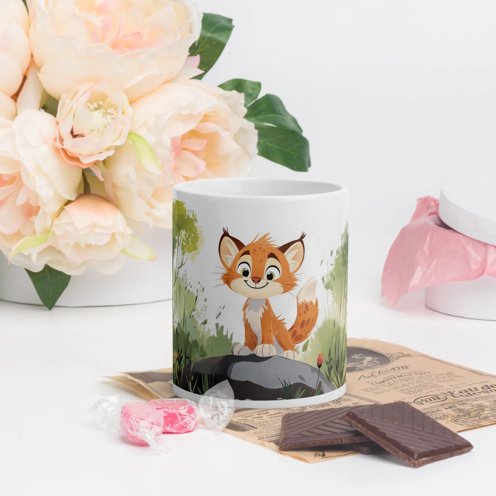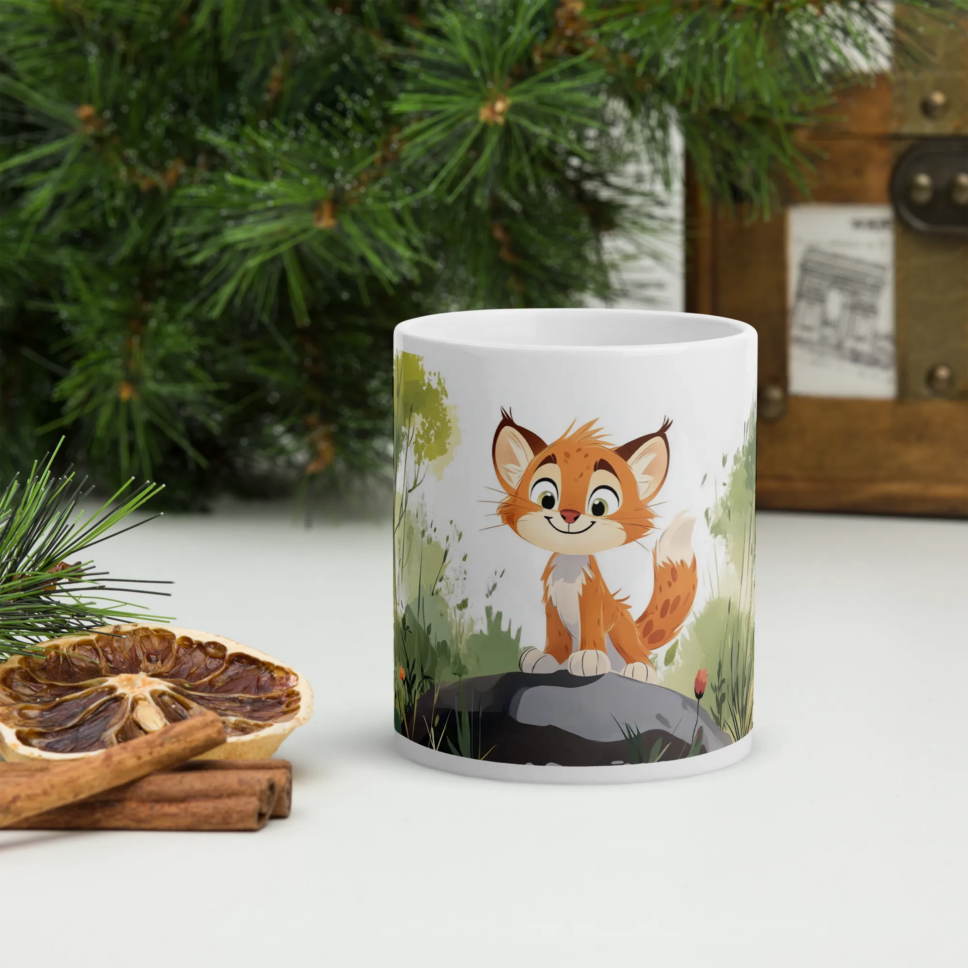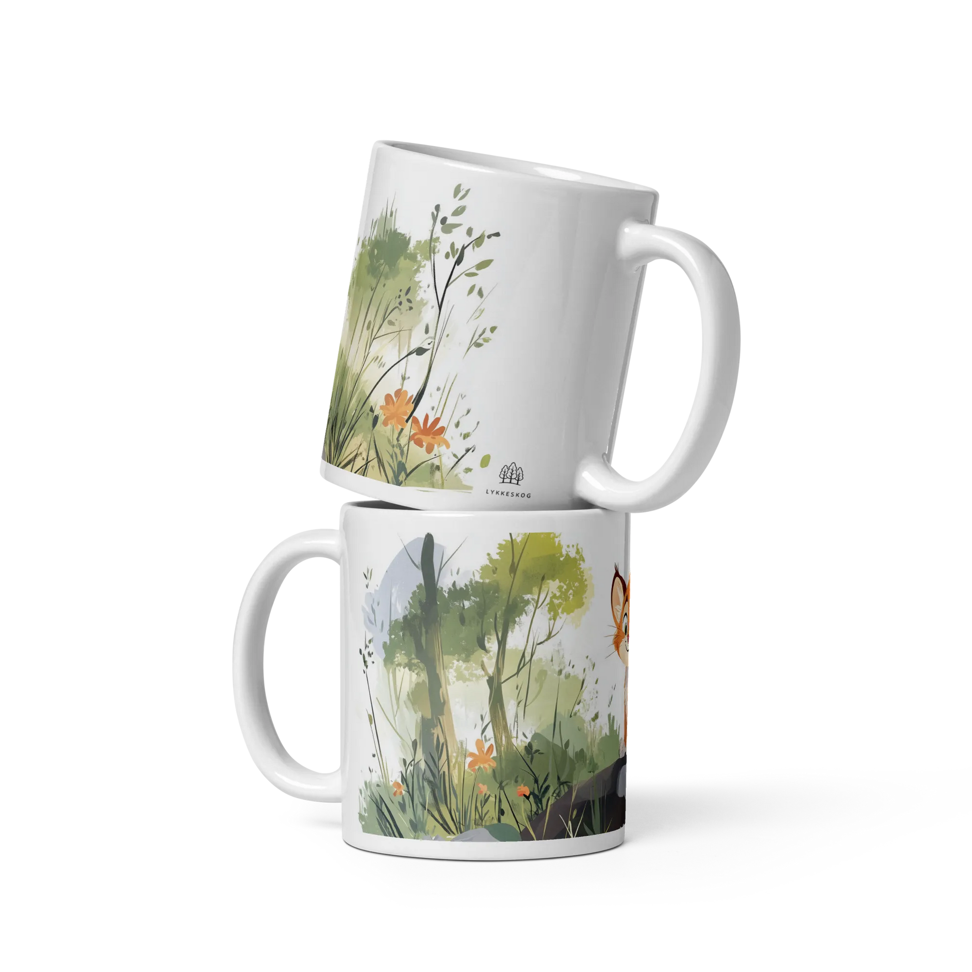 Denne nysgjerrige lille gaupa står stolt på en stein midt i skogen, omgitt av blomster og grønt. Med sitt lekne uttrykk og myke farger bringer motivet både liv og ro til kaffepausen. En herlig kopp for alle som elsker natur, dyr og det lille ekstra som gjør hverdagen koselig.